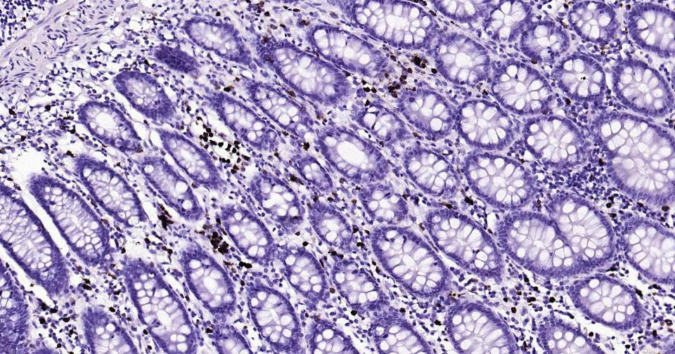 Paraformaldehyde-fixed, paraffin embedded Human Colon; Antigen retrieval by boiling in sodium citrate buffer (pH6.0) for 15 min; Antibody incubation with Granzyme B Monoclonal Antibody, Unconjugated(bsm-34135M) at 1:200 overnight at 4°C, followed by conjugation to the bs-40296G-HRP and DAB (C-0010) staining.