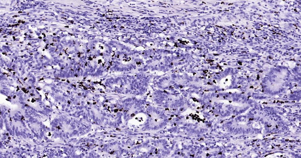 Paraformaldehyde-fixed, paraffin embedded Human Colon Cancer; Antigen retrieval by boiling in sodium citrate buffer (pH6.0) for 15 min; Antibody incubation with Granzyme B Monoclonal Antibody, Unconjugated(bsm-34135M) at 1:200 overnight at 4°C, followed by conjugation to the bs-40296G-HRP and DAB (C-0010) staining.