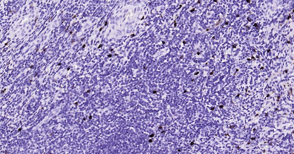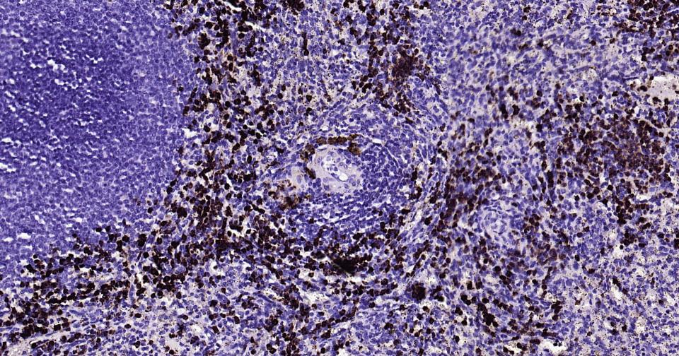Paraformaldehyde-fixed, paraffin embedded Human Spleen; Antigen retrieval by boiling in sodium citrate buffer (pH6.0) for 15 min; Antibody incubation with Granzyme B Monoclonal Antibody, Unconjugated(bsm-34135M) at 1:200 overnight at 4°C, followed by conjugation to the bs-40296G-HRP and DAB (C-0010) staining.