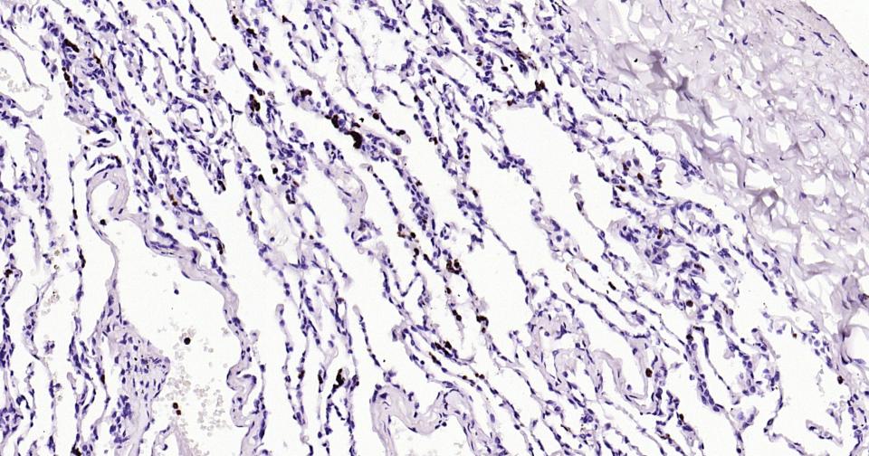 Paraformaldehyde-fixed, paraffin embedded Human Lung; Antigen retrieval by boiling in sodium citrate buffer (pH6.0) for 15 min; Antibody incubation with Granzyme B Monoclonal Antibody, Unconjugated(bsm-34135M) at 1:200 overnight at 4°C, followed by conjugation to the bs-40296G-HRP and DAB (C-0010) staining.