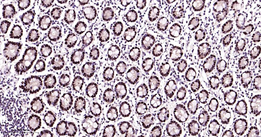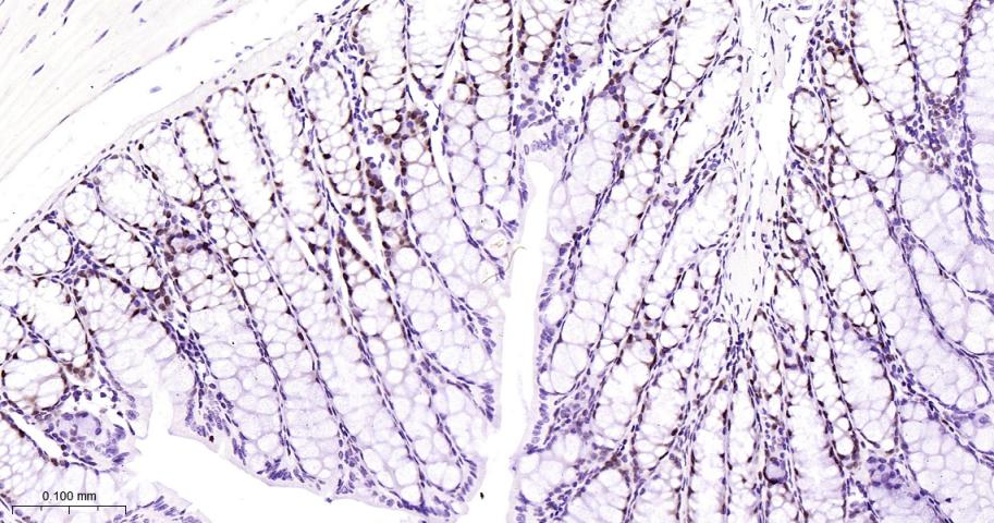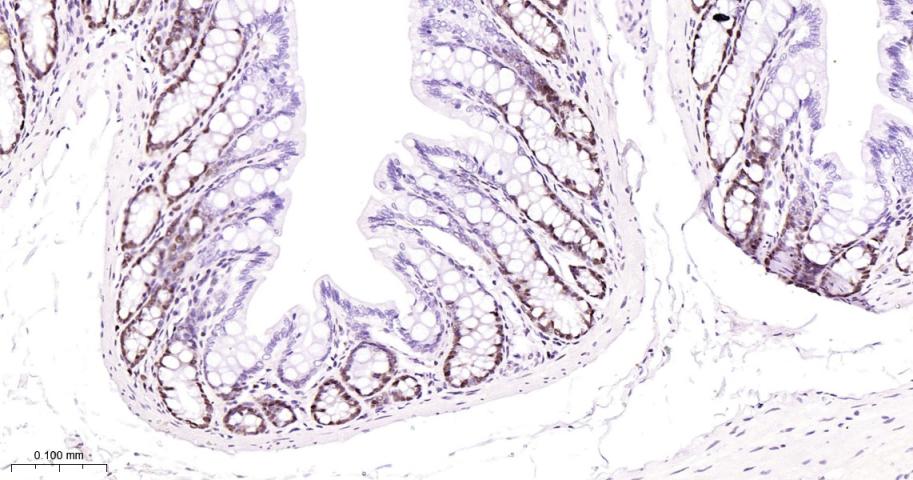 Paraformaldehyde-fixed, paraffin embedded Mouse Colon; Antigen retrieval by boiling in sodium citrate buffer (pH6.0) for 15 min; Antibody incubation with PCNA Monoclonal Antibody, Unconjugated(bsm-33035R) at 1:200 overnight at 4°C, followed by conjugation to the bs-0295G-HRP and DAB (C-0010) staining.