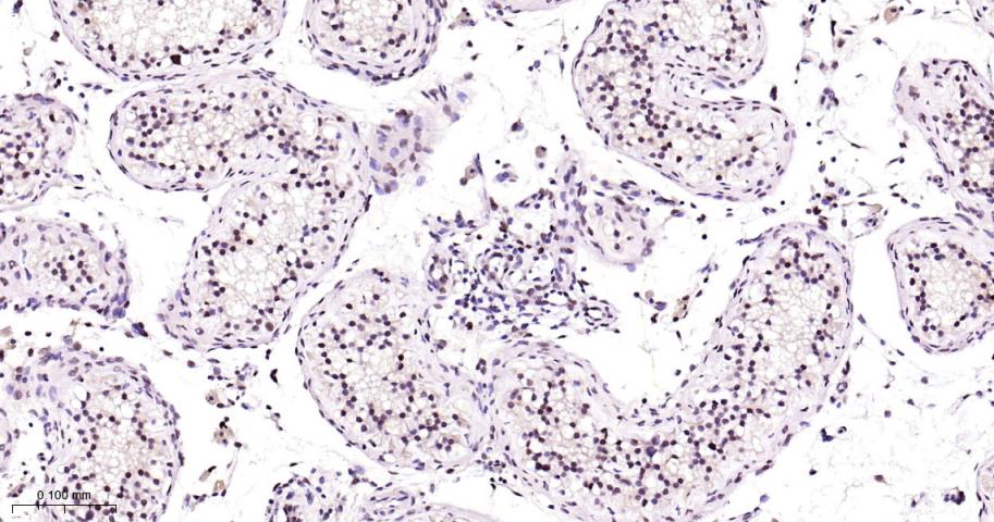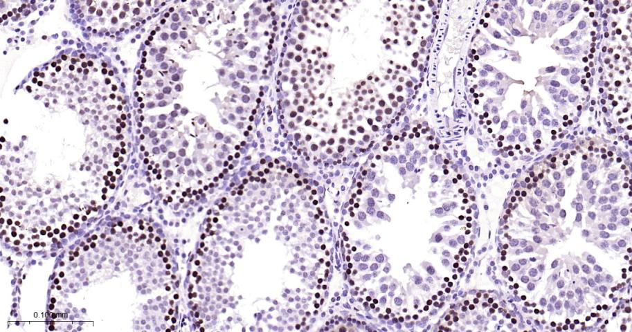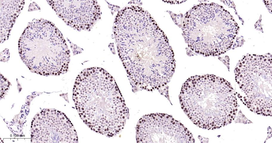 Paraformaldehyde-fixed, paraffin embedded Rat Testicles; Antigen retrieval by boiling in sodium citrate buffer (pH6.0) for 15 min; Antibody incubation with PCNA Monoclonal Antibody, Unconjugated(bsm-33035R) at 1:200 overnight at 4°C, followed by conjugation to the bs-0295G-HRP and DAB (C-0010) staining.