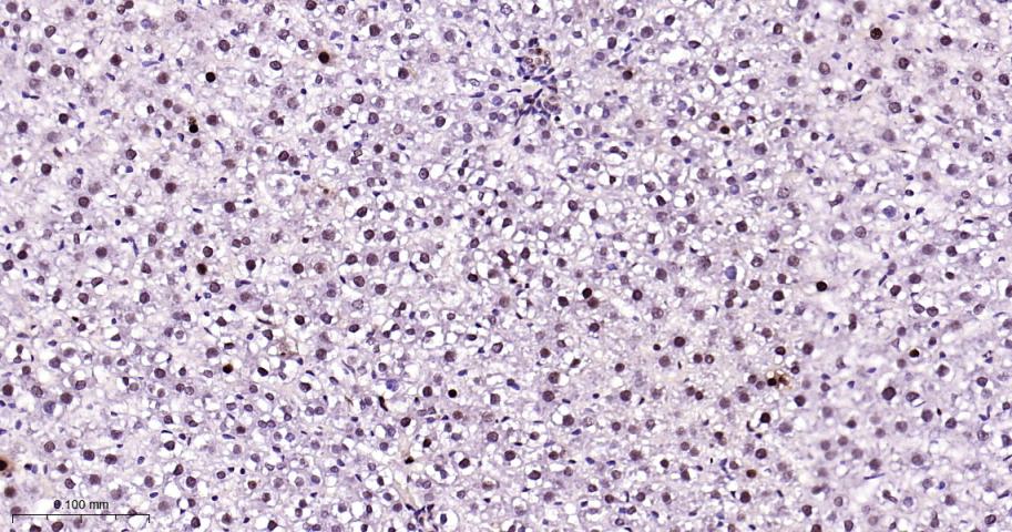 Paraformaldehyde-fixed, paraffin embedded Rat Liver; Antigen retrieval by boiling in sodium citrate buffer (pH6.0) for 15 min; Antibody incubation with PCNA Monoclonal Antibody, Unconjugated(bsm-33035R) at 1:200 overnight at 4°C, followed by conjugation to the bs-0295G-HRP and DAB (C-0010) staining.
