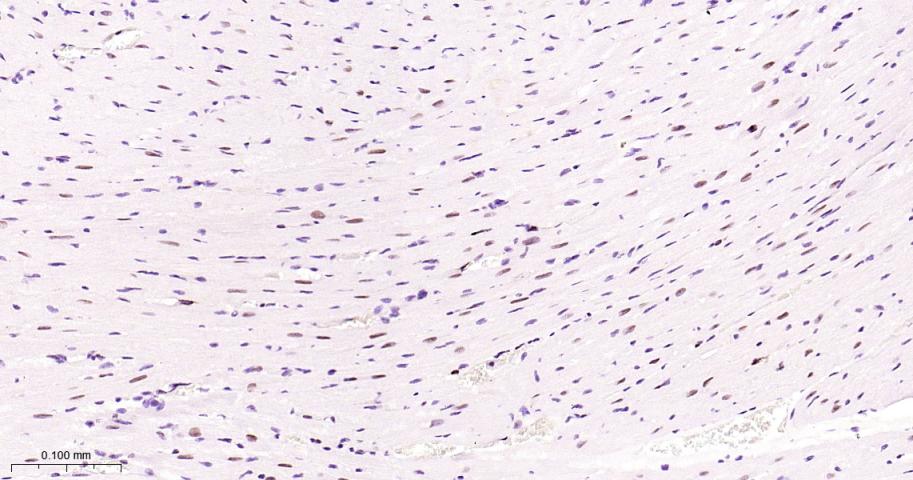 Paraformaldehyde-fixed, paraffin embedded Mouse Heart; Antigen retrieval by boiling in sodium citrate buffer (pH6.0) for 15 min; Antibody incubation with PCNA Monoclonal Antibody, Unconjugated(bsm-33035R) at 1:200 overnight at 4°C, followed by conjugation to the bs-0295G-HRP and DAB (C-0010) staining.