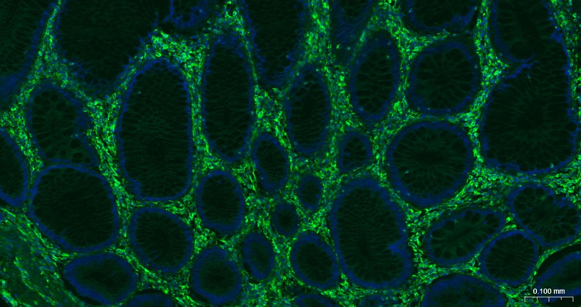 Paraformaldehyde-fixed, paraffin embedded Human Colon; Antigen retrieval by boiling in sodium citrate buffer (pH6.0) for 15 min; The section was incubated with Vimentin Monoclonal Antibody, Unconjugated (bsm-33170M) at 1:200 overnight at 4°C. Followed by conjugated Goat Anti-Mouse IgG antibody (Green,bs-60296G-BF488), DAPI (blue, C02-04002) was used to stain the cell nuclei.