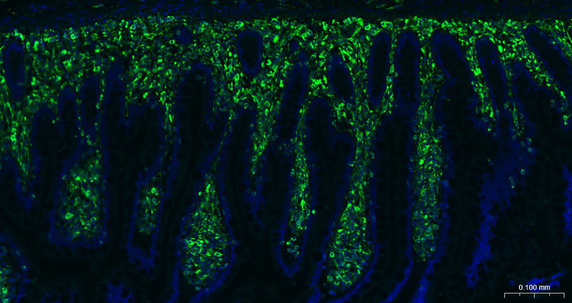 Paraformaldehyde-fixed, paraffin embedded Human Small Intestine; Antigen retrieval by boiling in sodium citrate buffer (pH6.0) for 15 min; The section was incubated with Vimentin Monoclonal Antibody, Unconjugated (bsm-33170M) at 1:200 overnight at 4°C. Followed by conjugated Goat Anti-Mouse IgG antibody (Green,bs-60296G-BF488), DAPI (blue, C02-04002) was used to stain the cell nuclei.
