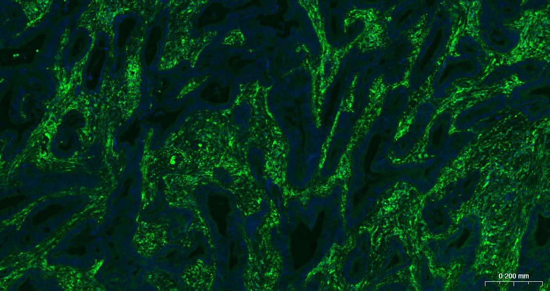 Paraformaldehyde-fixed, paraffin embedded Human Colon Cancer; Antigen retrieval by boiling in sodium citrate buffer (pH6.0) for 15 min; The section was incubated with Vimentin Monoclonal Antibody, Unconjugated (bsm-33170M) at 1:200 overnight at 4°C. Followed by conjugated Goat Anti-Mouse IgG antibody (Green,bs-60296G-BF488), DAPI (blue, C02-04002) was used to stain the cell nuclei.