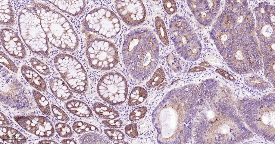 Paraformaldehyde-fixed, paraffin embedded Human Colon Cancer; Antigen retrieval by boiling in sodium citrate buffer (pH6.0) for 15 min; Antibody incubation with Desmoglein 2 Monoclonal Antibody, Unconjugated(bsm-54310R) at 1:200 overnight at 4°C, followed by conjugation to the bs-0295G-HRP and DAB (C-0010) staining.