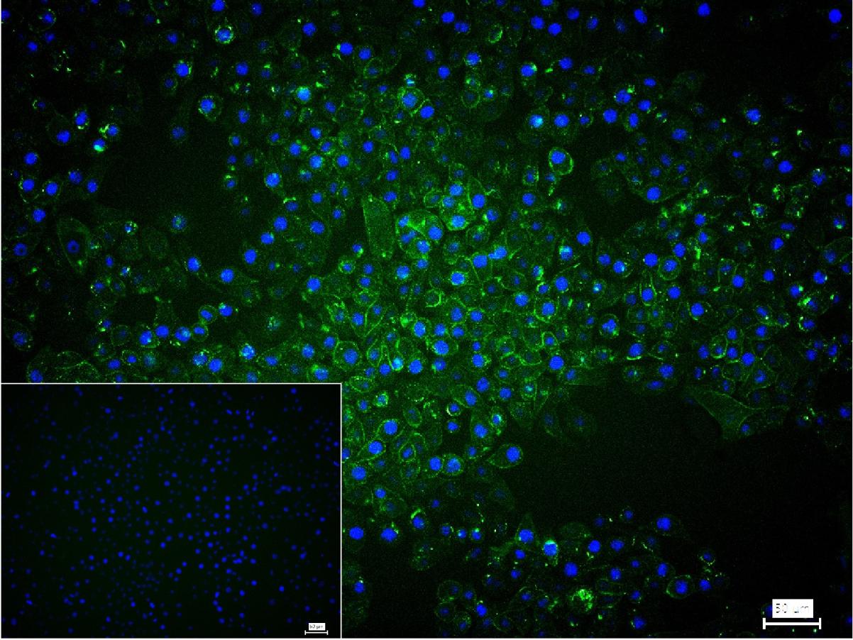 4% Paraformaldehyde-fixed HepG2 (H) cell; Triton X-100 at r.t. for 20 min; Antibody incubation with (Desmoglein 2) monoclonal Antibody, unconjugated (bsm-54310R) 1:100, 90 min at 37°C; followed by conjugated Goat Anti-Rabbit IgG antibody (green, bs-60295G-BF488) at 37°C for 90 min, DAPI (blue, C02-04002) was used to stain the cell nuclei. PBS instead of the primary antibody was used as the blank control.
