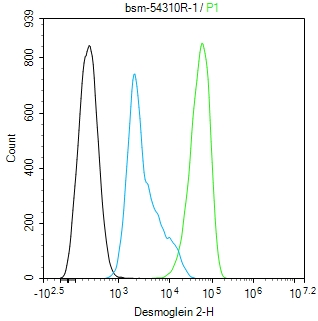 The HepG2 (H) cells were fixed with 4% PFA (10 min at r.t.) and then permeabilized with 90% ice-cold methanol for 20 min at -20℃,the cells then were incubated in 5%BSA to block non-specific protein-protein interactions (30 min at r.t.).Primary Antibody (green):Rabbit Anti-Desmoglein 2 antibody (bsm-54310R,1:100); Secondary Antibody (white blue): Goat anti-Rabbit IgG-BF488 (bs-60295G-BF488): 1 μg/test. Blank control (black): PBS. Acquisition of 20,000 events was performed.