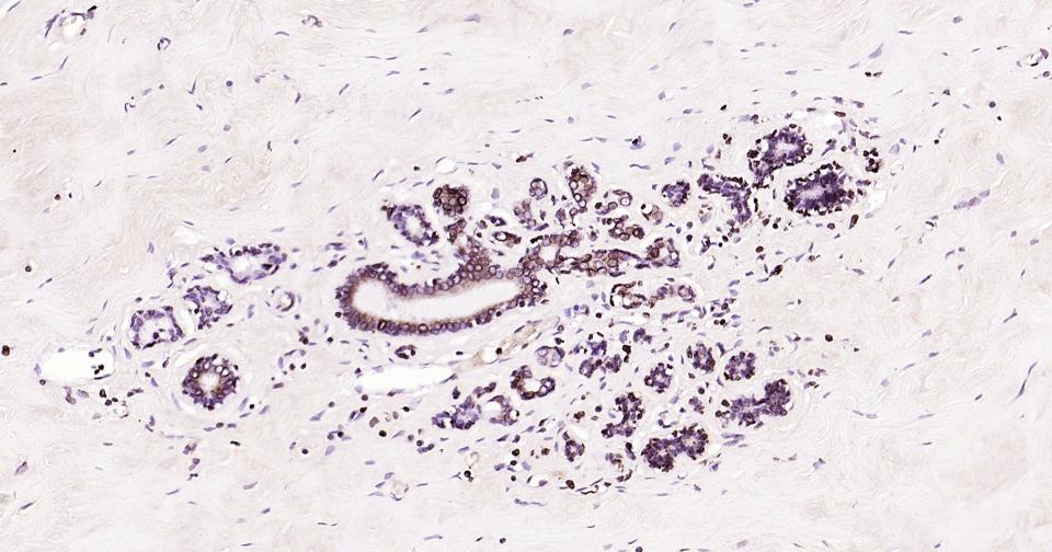 Paraformaldehyde-fixed, paraffin embedded Human Breast; Antigen retrieval by boiling in sodium citrate buffer (pH6.0) for 15 min; Antibody incubation with lamin B1 Monoclonal Antibody, Unconjugated(bsm-52361R) at 1:200 overnight at 4°C, followed by conjugation to the bs-0295G-HRP and DAB (C-0010) staining.