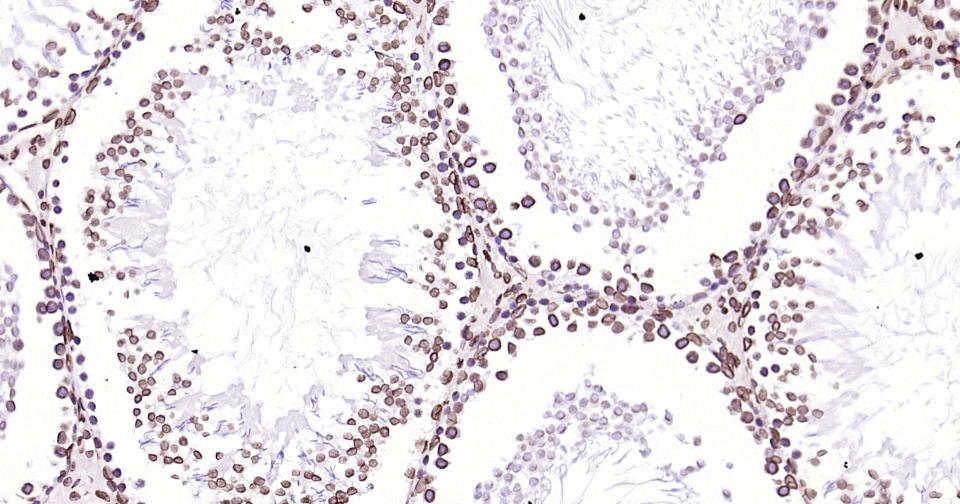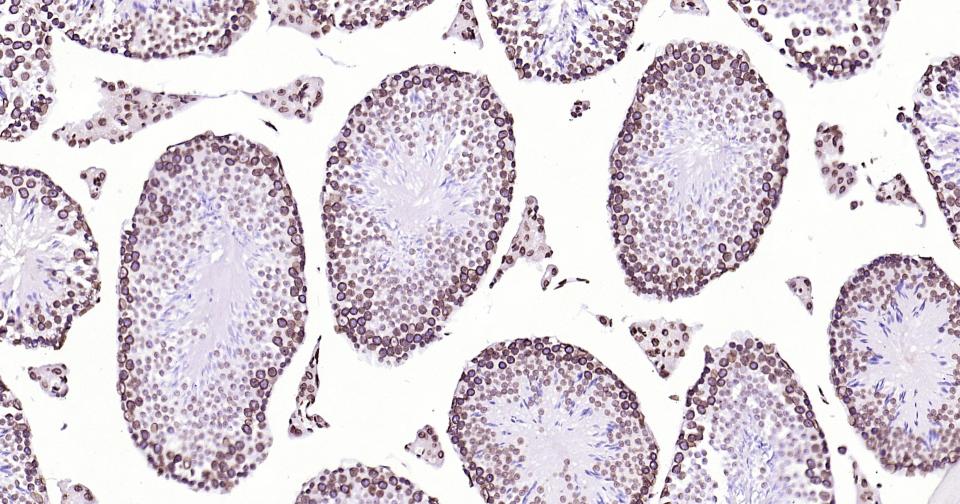 Paraformaldehyde-fixed, paraffin embedded Mouse Testicles; Antigen retrieval by boiling in sodium citrate buffer (pH6.0) for 15 min; Antibody incubation with lamin B1 Monoclonal Antibody, Unconjugated(bsm-52361R) at 1:200 overnight at 4°C, followed by conjugation to the bs-0295G-HRP and DAB (C-0010) staining.