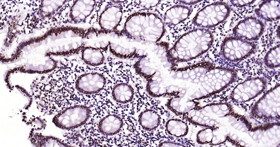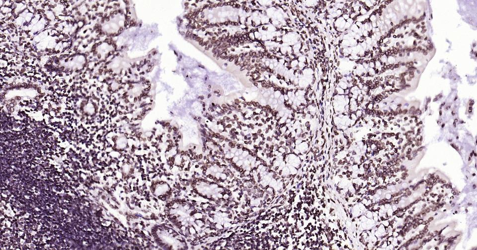 Paraformaldehyde-fixed, paraffin embedded Mouse Colon; Antigen retrieval by boiling in sodium citrate buffer (pH6.0) for 15 min; Antibody incubation with lamin B1 Monoclonal Antibody, Unconjugated(bsm-52361R) at 1:200 overnight at 4°C, followed by conjugation to the bs-0295G-HRP and DAB (C-0010) staining.