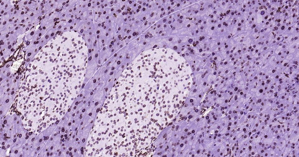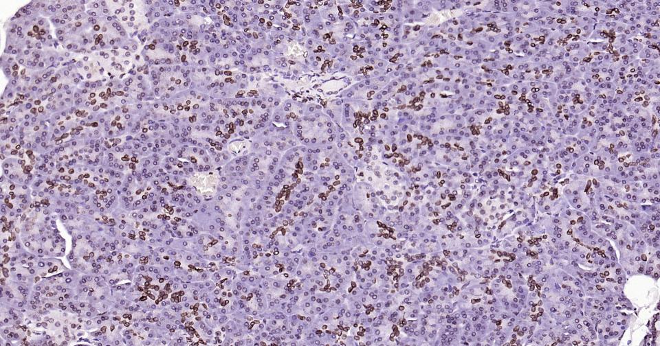 Paraformaldehyde-fixed, paraffin embedded Rat Pancreas; Antigen retrieval by boiling in sodium citrate buffer (pH6.0) for 15 min; Antibody incubation with lamin B1 Monoclonal Antibody, Unconjugated(bsm-52361R) at 1:200 overnight at 4°C, followed by conjugation to the bs-0295G-HRP and DAB (C-0010) staining.