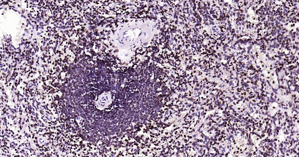Paraformaldehyde-fixed, paraffin embedded Rat Spleen; Antigen retrieval by boiling in sodium citrate buffer (pH6.0) for 15 min; Antibody incubation with lamin B1 Monoclonal Antibody, Unconjugated(bsm-52361R) at 1:200 overnight at 4°C, followed by conjugation to the bs-0295G-HRP and DAB (C-0010) staining.