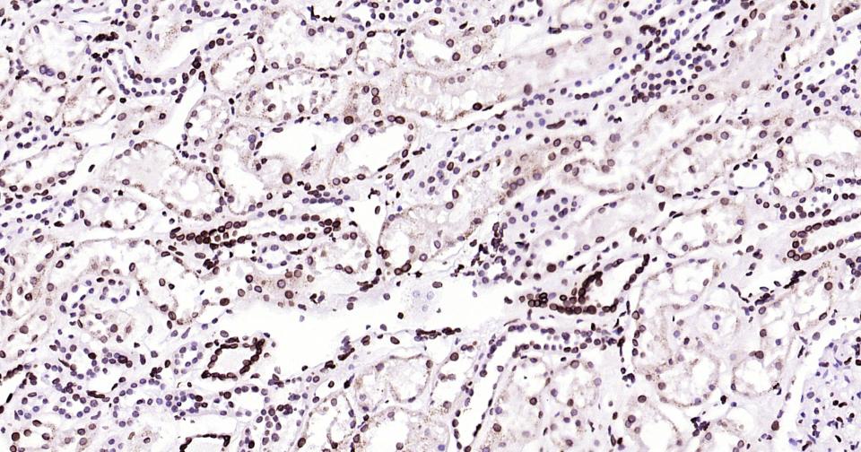 Paraformaldehyde-fixed, paraffin embedded Human Kidney; Antigen retrieval by boiling in sodium citrate buffer (pH6.0) for 15 min; Antibody incubation with lamin B1 Monoclonal Antibody, Unconjugated(bsm-52361R) at 1:200 overnight at 4°C, followed by conjugation to the bs-0295G-HRP and DAB (C-0010) staining.