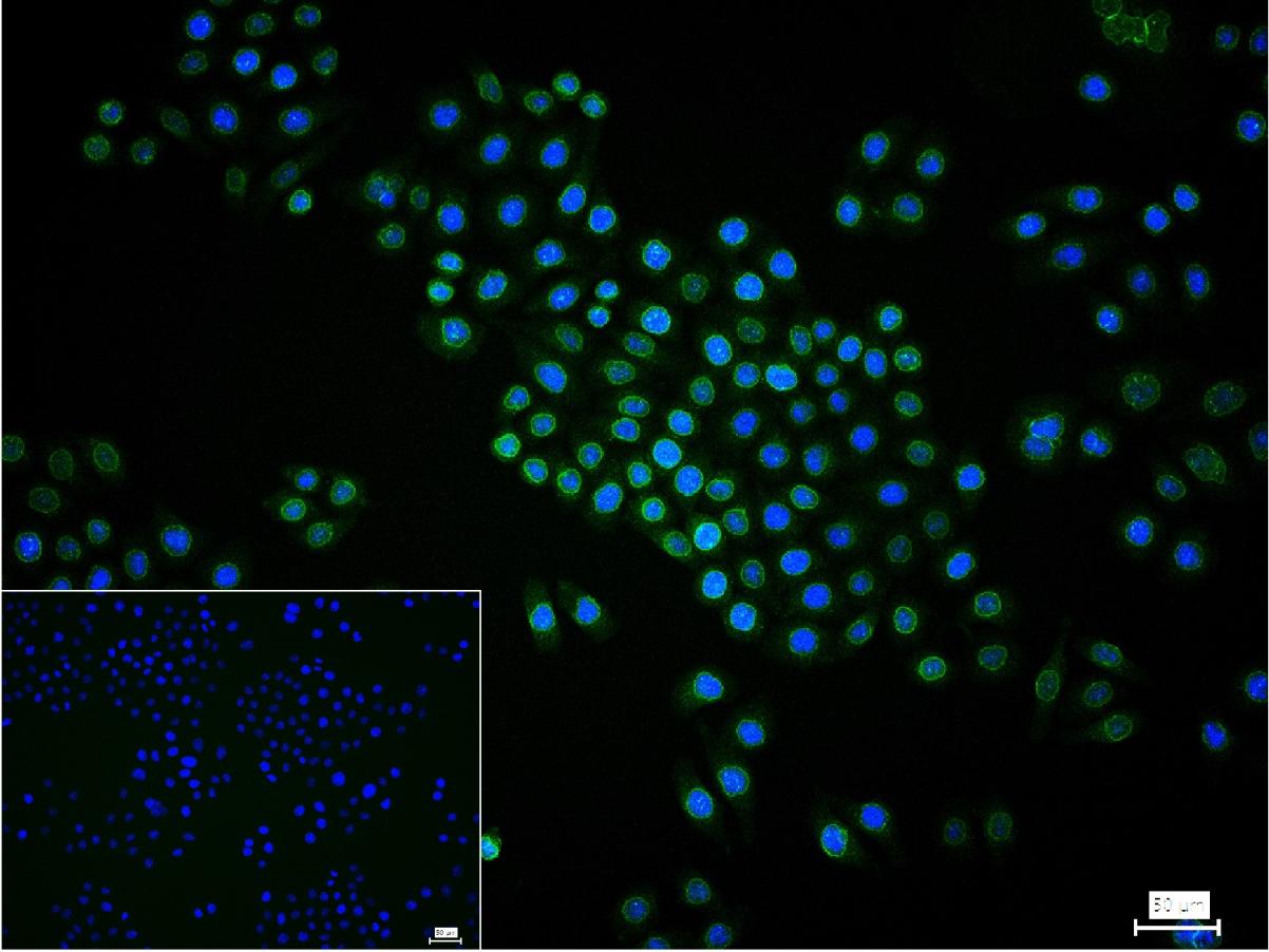 4% Paraformaldehyde-fixed Hela (H) cell; Triton X-100 at r.t. for 20 min; Antibody incubation with (lamin B1) monoclonal Antibody, unconjugated (bsm-52361R) 1:100, 90 min at 37°C; followed by conjugated Goat Anti-Rabbit IgG antibody (green, bs-60295G-BF488) at 37°C for 90 min, DAPI (blue, C02-04002) was used to stain the cell nuclei. PBS instead of the primary antibody was used as the blank control.