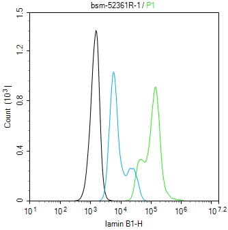 The Hela (H) cells were fixed with 4% PFA (10 min at r.t.) and then permeabilized with 90% ice-cold methanol for 20 min at -20℃,the cells then were incubated in 5%BSA to block non-specific protein-protein interactions (30 min at r.t.).Primary Antibody (green):Rabbit Anti-lamin B1 antibody (bsm-52361R): 1 μg/10^6 cells; Secondary Antibody (white blue): Goat anti-Rabbit IgG-BF488 (bs-60295G-BF488): 1 μg/test. Blank control (black): PBS. Acquisition of 20,000 events was performed.