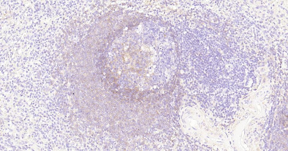 Paraformaldehyde-fixed, paraffin embedded Human Spleen; Antigen retrieval by boiling in sodium citrate buffer (pH6.0) for 15 min; Antibody incubation with CD73 Monoclonal Antibody, Unconjugated(bsm-52916R) at 1:200 overnight at 4°C, followed by conjugation to the SP Kit (Rabbit, SP-0023) and DAB (C-0010) staining.