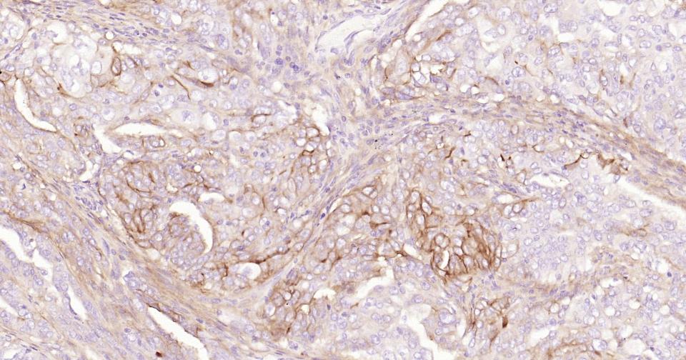 Paraformaldehyde-fixed, paraffin embedded Human Lung Cancer; Antigen retrieval by boiling in sodium citrate buffer (pH6.0) for 15 min; Antibody incubation with CD73 Monoclonal Antibody, Unconjugated(bsm-52916R) at 1:200 overnight at 4°C, followed by conjugation to the SP Kit (Rabbit, SP-0023) and DAB (C-0010) staining.