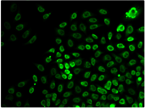 Hela cell; 4% Paraformaldehyde-fixed; Triton X-100 at room temperature for 20 min; Blocking buffer (normal goat serum, C-0005) at 37°C for 20 min; Antibody incubation with (KO Validated)SMARCA4 polyclonal Antibody, Unconjugated (bs-55203R) 1:100, 90 minutes at 37°C; followed by a conjugated Goat Anti-Rabbit IgG antibody at 37°C for 90 minutes.