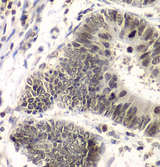 Paraformaldehyde-fixed, paraffin embedded (human colon); Antigen retrieval by boiling in sodium citrate buffer (pH6.0) for 15min; Block endogenous peroxidase by 3% hydrogen peroxide for 20 minutes; Blocking buffer (normal goat serum) at 37°C for 30min; Antibody incubation with (SMARCA4) Polyclonal Antibody, Unconjugated (bs-55203R) at 1:100 overnight at 4°C, followed by operating according to SP Kit(Rabbit) (sp-0023) instructionsand DAB staining.