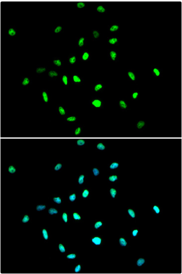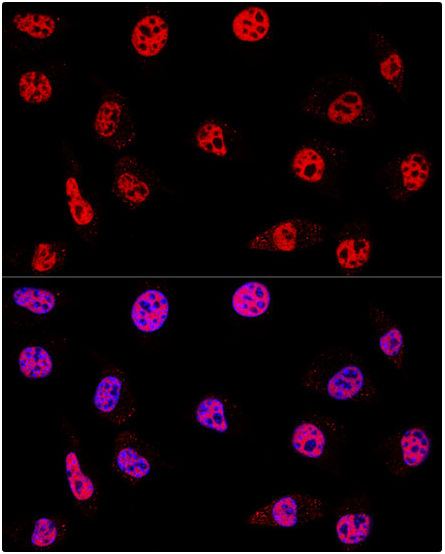 A549 cell; 4% Paraformaldehyde-fixed; Triton X-100 at room temperature for 20 min; Blocking buffer (normal goat serum, C-0005) at 37°C for 20 min; Antibody incubation with (KO Validated)HDAC1 polyclonal Antibody, Unconjugated (bs-55093R) 1:100, 90 minutes at 37°C; followed by a conjugated Goat Anti-Rabbit IgG antibody at 37°C for 90 minutes, DAPI (blue, C02-04002) was used to stain the cell nuclei.