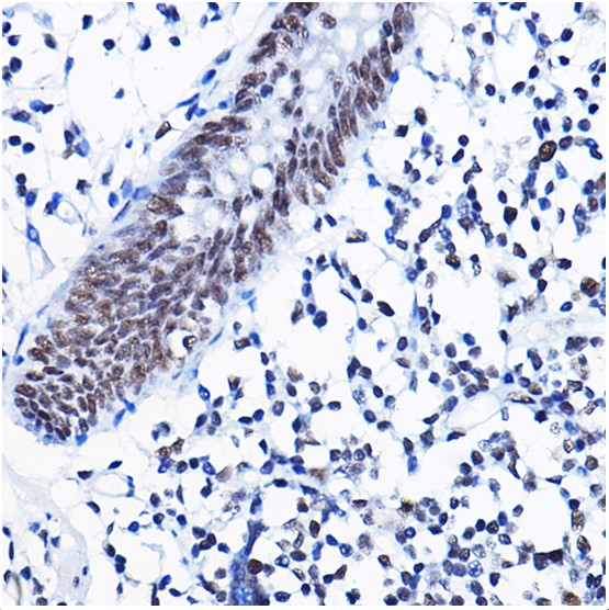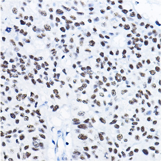 Paraformaldehyde-fixed, paraffin embedded (human lung cancer); Antigen retrieval by boiling in sodium citrate buffer (pH6.0) for 15min; Block endogenous peroxidase by 3% hydrogen peroxide for 20 minutes; Blocking buffer (normal goat serum) at 37°C for 30min; Antibody incubation with (HDAC1) Polyclonal Antibody, Unconjugated (bs-55093R) at 1:50 overnight at 4°C, followed by operating according to SP Kit(Rabbit) (sp-0023) instructionsand DAB staining.