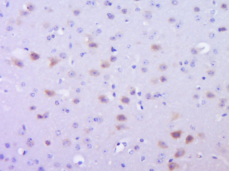 Paraformaldehyde-fixed, paraffin embedded (mouse brain); Antigen retrieval by boiling in sodium citrate buffer (pH6.0) for 15min; Block endogenous peroxidase by 3% hydrogen peroxide for 20 minutes; Blocking buffer (normal goat serum) at 37°C for 30min; Antibody incubation with (phospho-SMAD2 (Ser464)) Polyclonal Antibody, Unconjugated (bs-24530R) at 1:400 overnight at 4°C, followed by operating according to SP Kit(Rabbit) (sp-0023) instructionsand DAB staining.