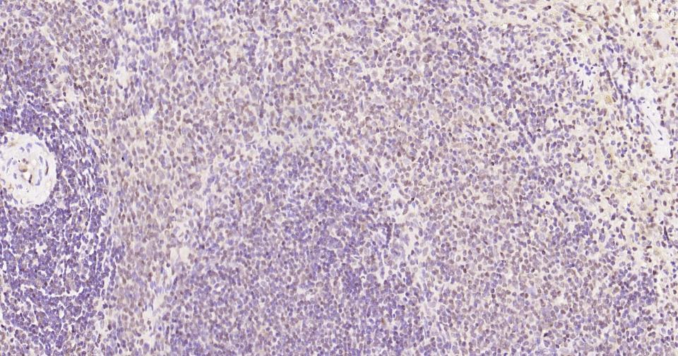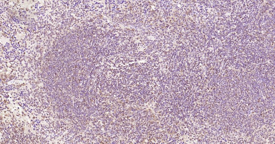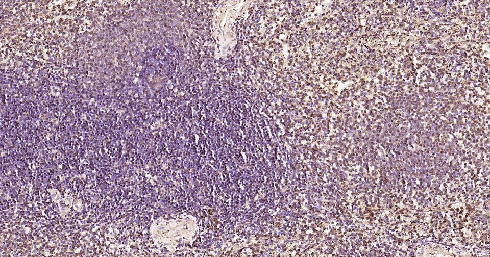Paraformaldehyde-fixed, paraffin embedded Human Spleen; Antigen retrieval by boiling in sodium citrate buffer (pH6.0) for 15 min; Antibody incubation with GAPDH Monoclonal Antibody, Unconjugated(bsm-52262R) at 1:250 overnight at 4°C, followed by conjugation to the SP Kit (Rabbit, SP-0023) and DAB (C-0010) staining.