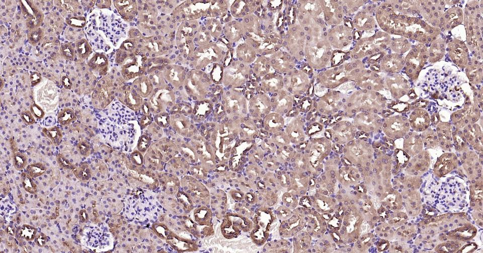 Paraformaldehyde-fixed, paraffin embedded Rat Kidney; Antigen retrieval by boiling in sodium citrate buffer (pH6.0) for 15 min; Antibody incubation with GAPDH Monoclonal Antibody, Unconjugated(bsm-52262R) at 1:250 overnight at 4°C, followed by conjugation to the SP Kit (Rabbit, SP-0023) and DAB (C-0010) staining.