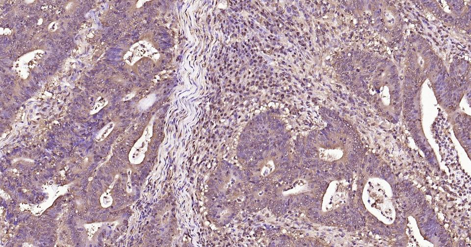 Paraformaldehyde-fixed, paraffin embedded Human Colon Cancer; Antigen retrieval by boiling in sodium citrate buffer (pH6.0) for 15 min; Antibody incubation with GAPDH Monoclonal Antibody, Unconjugated(bsm-52262R) at 1:250 overnight at 4°C, followed by conjugation to the SP Kit (Rabbit, SP-0023) and DAB (C-0010) staining.