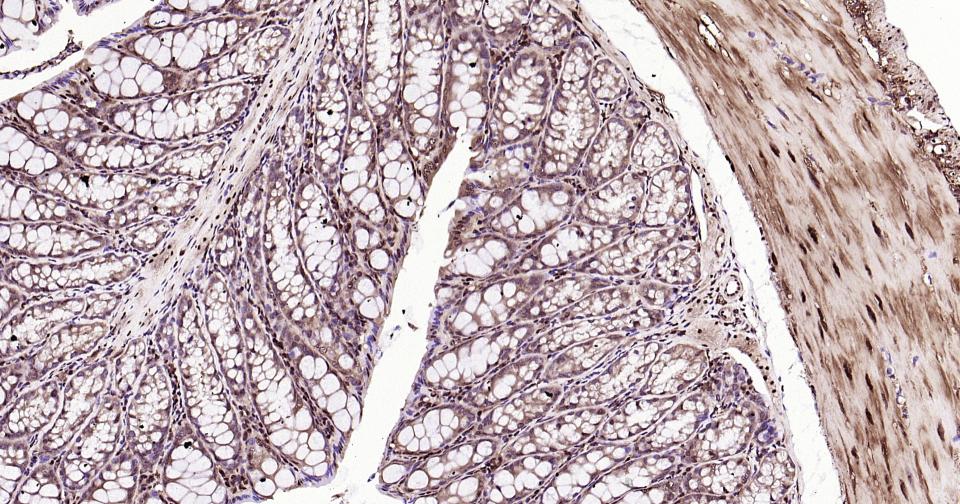 Paraformaldehyde-fixed, paraffin embedded Mouse Colon; Antigen retrieval by boiling in sodium citrate buffer (pH6.0) for 15 min; Antibody incubation with GAPDH Monoclonal Antibody, Unconjugated(bsm-52262R) at 1:250 overnight at 4°C, followed by conjugation to the SP Kit (Rabbit, SP-0023) and DAB (C-0010) staining.