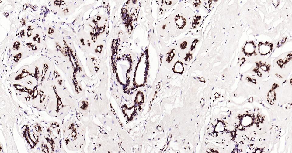 Paraformaldehyde-fixed, paraffin embedded Human Breast Cancer; Antigen retrieval by boiling in sodium citrate buffer (pH6.0) for 15 min; Antibody incubation with GAPDH Monoclonal Antibody, Unconjugated(bsm-52262R) at 1:250 overnight at 4°C, followed by conjugation to the SP Kit (Rabbit, SP-0023) and DAB (C-0010) staining.