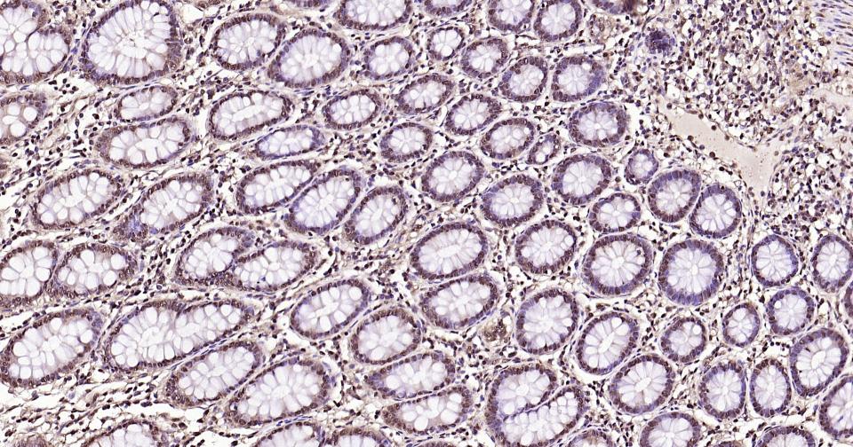 Paraformaldehyde-fixed, paraffin embedded Human Colon; Antigen retrieval by boiling in sodium citrate buffer (pH6.0) for 15 min; Antibody incubation with GAPDH Monoclonal Antibody, Unconjugated(bsm-52262R) at 1:250 overnight at 4°C, followed by conjugation to the SP Kit (Rabbit, SP-0023) and DAB (C-0010) staining.