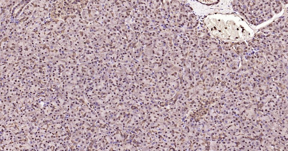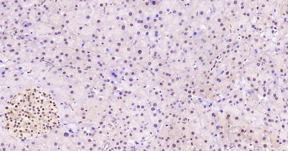Paraformaldehyde-fixed, paraffin embedded Rat Pancreas; Antigen retrieval by boiling in sodium citrate buffer (pH6.0) for 15 min; Antibody incubation with GAPDH Monoclonal Antibody, Unconjugated(bsm-52262R) at 1:250 overnight at 4°C, followed by conjugation to the SP Kit (Rabbit, SP-0023) and DAB (C-0010) staining.