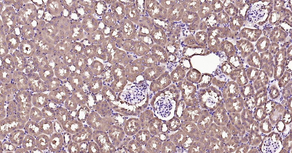 Paraformaldehyde-fixed, paraffin embedded Mouse Kidney; Antigen retrieval by boiling in sodium citrate buffer (pH6.0) for 15 min; Antibody incubation with GAPDH Monoclonal Antibody, Unconjugated(bsm-52262R) at 1:250 overnight at 4°C, followed by conjugation to the SP Kit (Rabbit, SP-0023) and DAB (C-0010) staining.