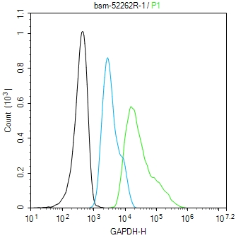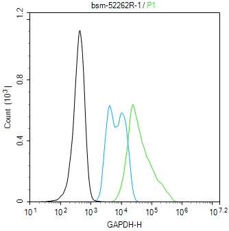 The Hela (H) cells were fixed with 4% PFA (10 min at r.t.) and then permeabilized with 90% ice-cold methanol for 20 min at -20℃,the cells then were incubated in 5%BSA to block non-specific protein-protein interactions (30 min at r.t.).Primary Antibody (green):Rabbit Anti-GAPDH antibody (bsm-52262R): 1 μg/10^6 cells; Secondary Antibody (white blue): Goat anti-Rabbit IgG-BF488 (bs-60295G-BF488): 1 μg/test. Blank control (black): PBS. Acquisition of 20,000 events was performed.