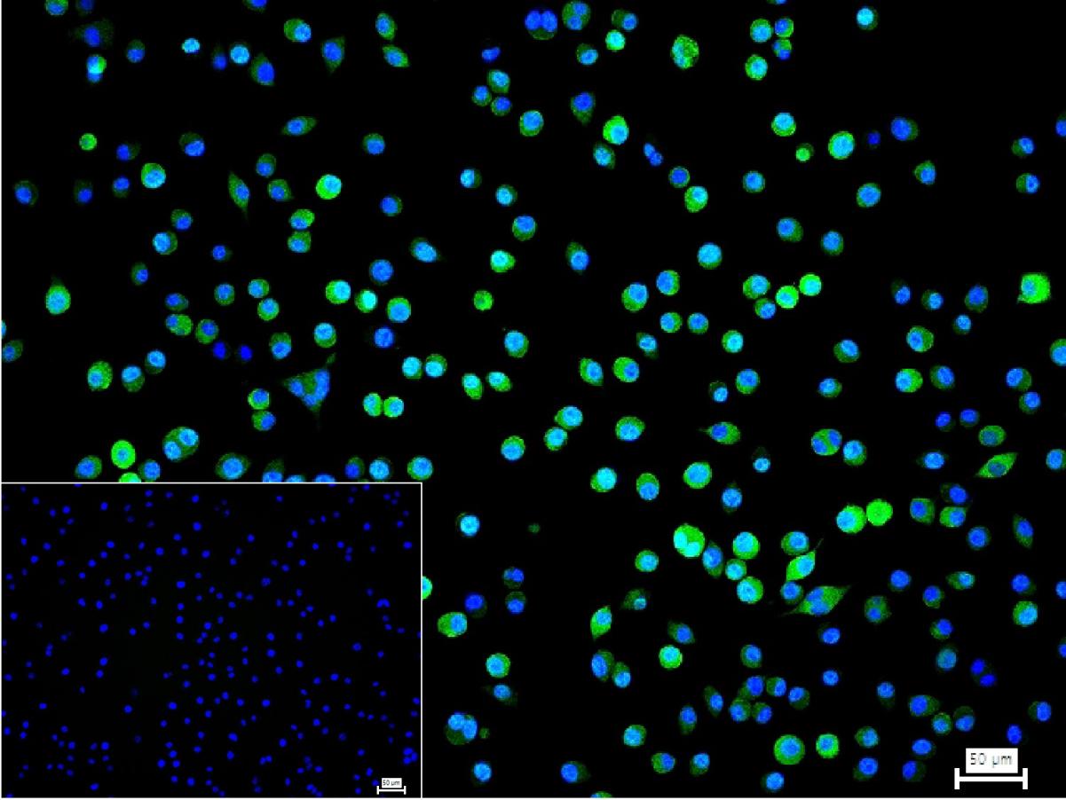 4% Paraformaldehyde-fixed L-929 (M) cell; Triton X-100 at r.t. for 20 min; Antibody incubation with (GAPDH) monoclonal Antibody, unconjugated (bsm-52262R) 1:100, 90 min at 37°C; followed by conjugated Goat Anti-Rabbit IgG antibody (green, bs-60295G-BF488) at 37°C for 90 min, DAPI (blue, C02-04002) was used to stain the cell nuclei. PBS instead of the primary antibody was used as the blank control.