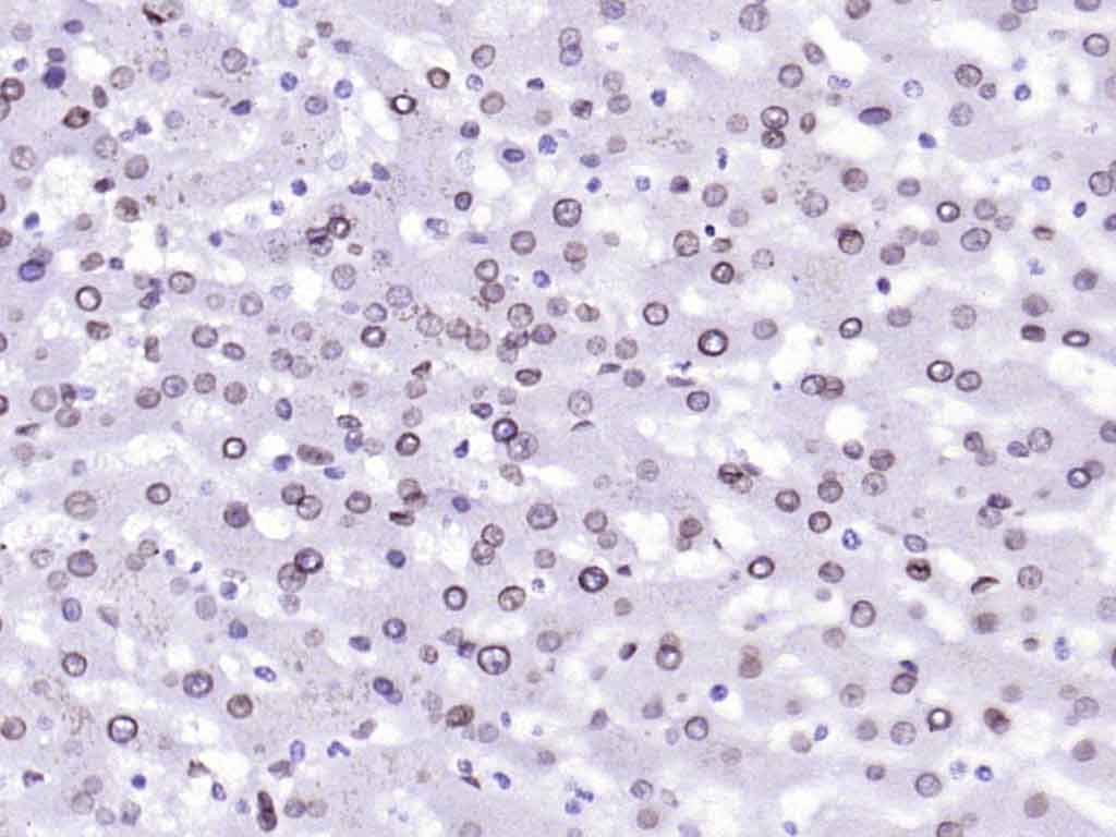 Paraformaldehyde-fixed, paraffin embedded (mouse liver); Antigen retrieval by boiling in sodium citrate buffer (pH6.0) for 15min; Block endogenous peroxidase by 3% hydrogen peroxide for 20 minutes; Blocking buffer (normal goat serum) at 37°C for 30min; Antibody incubation with (Lamin A C) Monoclonal Antibody, Unconjugated (bsm-34042M ) at 1:200 overnight at 4°C, followed by operating according to SP Kit(Mouse)(sp-0024) instructionsand DAB staining.