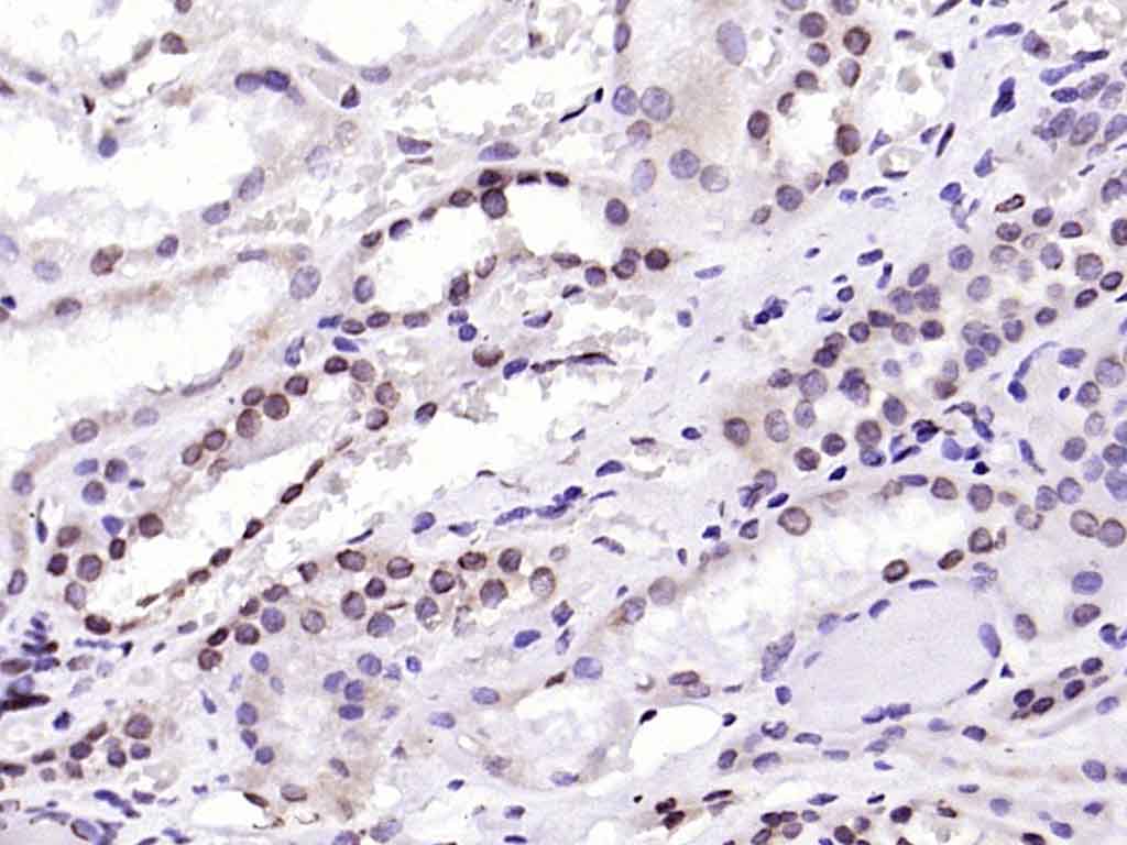 Paraformaldehyde-fixed, paraffin embedded (Human kidney); Antigen retrieval by boiling in sodium citrate buffer (pH6.0) for 15min; Block endogenous peroxidase by 3% hydrogen peroxide for 20 minutes; Blocking buffer (normal goat serum) at 37°C for 30min; Antibody incubation with (Lamin A C) Monoclonal Antibody, Unconjugated (bsm-34042M ) at 1:200 overnight at 4°C, followed by operating according to SP Kit(Mouse)(sp-0024) instructionsand DAB staining.