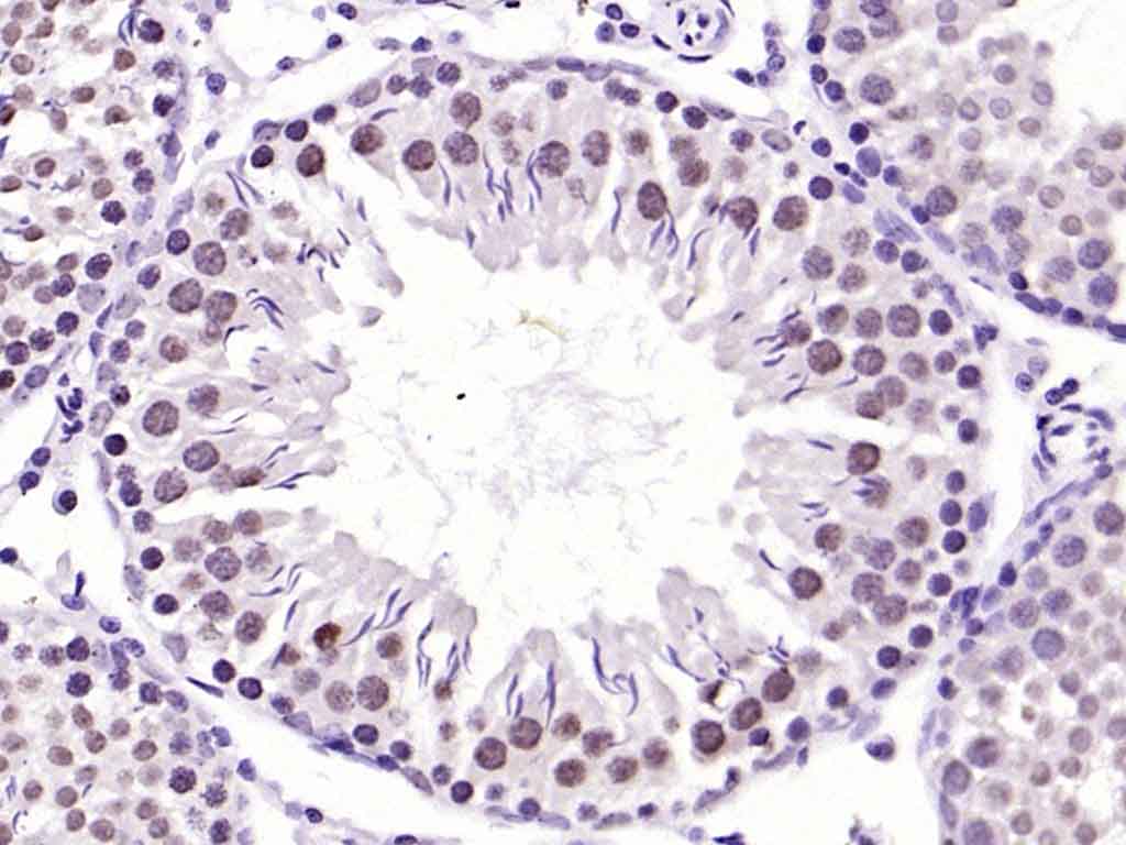 Paraformaldehyde-fixed, paraffin embedded (mouse testis); Antigen retrieval by boiling in sodium citrate buffer (pH6.0) for 15min; Block endogenous peroxidase by 3% hydrogen peroxide for 20 minutes; Blocking buffer (normal goat serum) at 37°C for 30min; Antibody incubation with (CAMK4) Monoclonal Antibody, Unconjugated (bsm-54336R) at 1:200 overnight at 4°C, followed by operating according to SP Kit(Rabbit) (sp-0023) instructionsand DAB staining.