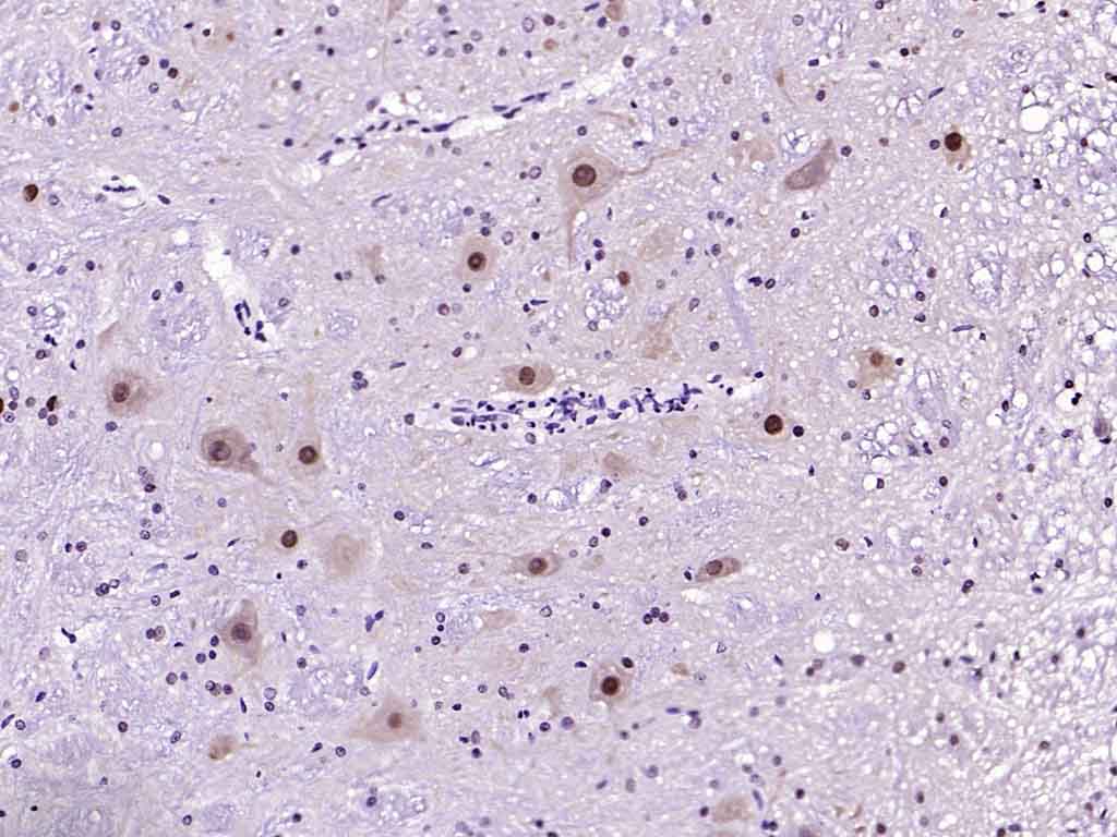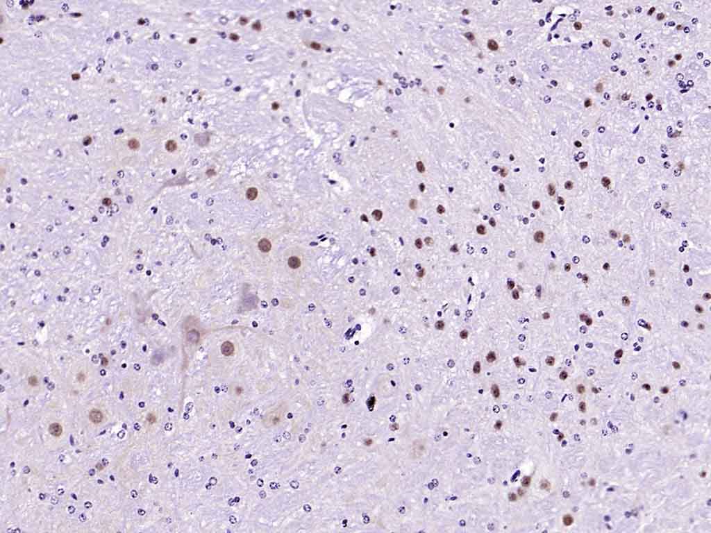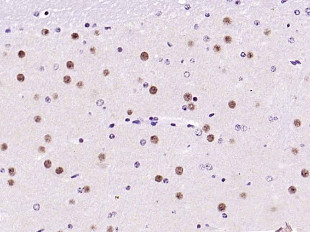 Paraformaldehyde-fixed, paraffin embedded (rat brain); Antigen retrieval by boiling in sodium citrate buffer (pH6.0) for 15min; Block endogenous peroxidase by 3% hydrogen peroxide for 20 minutes; Blocking buffer (normal goat serum) at 37°C for 30min; Antibody incubation with (CAMK4) Monoclonal Antibody, Unconjugated (bsm-54336R) at 1:200 overnight at 4°C, followed by operating according to SP Kit(Rabbit) (sp-0023) instructionsand DAB staining.
