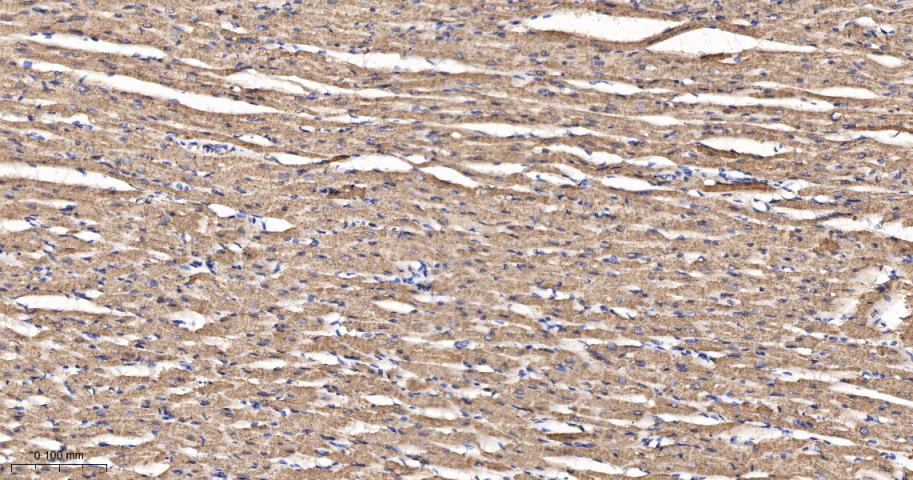 Paraformaldehyde-fixed, paraffin embedded Rat Heart; Antigen retrieval by boiling in sodium citrate buffer (pH6.0) for 15 min; The section was incubated with TSG101 Monoclonal Antibody, Unconjugated (bsm-52746R) at 1:200 overnight at 4°C, followed by conjugation to the bs-0295G-HRP and DAB (C-0010) staining.