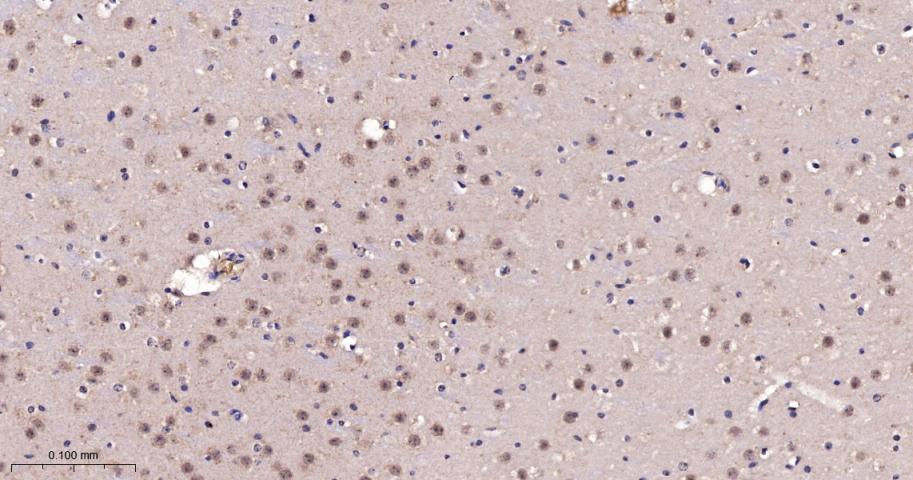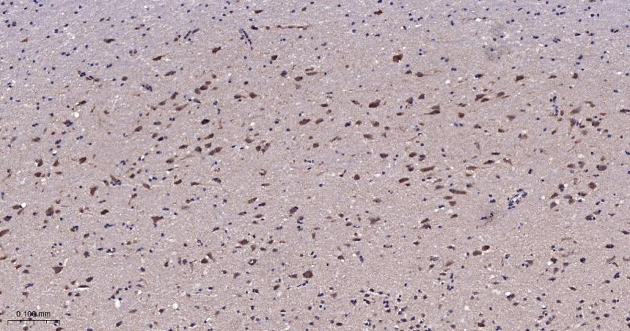 Paraformaldehyde-fixed, paraffin embedded Rat Cerebrum; Antigen retrieval by boiling in sodium citrate buffer (pH6.0) for 15 min; The section was incubated with TSG101 Monoclonal Antibody, Unconjugated (bsm-52746R) at 1:200 overnight at 4°C, followed by conjugation to the bs-0295G-HRP and DAB (C-0010) staining.