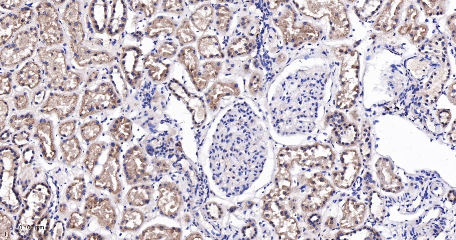 Paraformaldehyde-fixed, paraffin embedded Human Kidney; Antigen retrieval by boiling in sodium citrate buffer (pH6.0) for 15 min; The section was incubated with TSG101 Monoclonal Antibody, Unconjugated (bsm-52746R) at 1:200 overnight at 4°C, followed by conjugation to the bs-0295G-HRP and DAB (C-0010) staining.