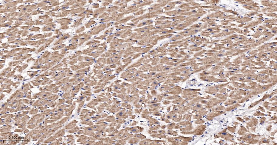 Paraformaldehyde-fixed, paraffin embedded Human Heart; Antigen retrieval by boiling in sodium citrate buffer (pH6.0) for 15 min; The section was incubated with TSG101 Monoclonal Antibody, Unconjugated (bsm-52746R) at 1:200 overnight at 4°C, followed by conjugation to the bs-0295G-HRP and DAB (C-0010) staining.