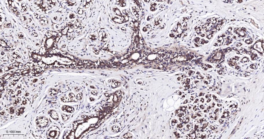 Paraformaldehyde-fixed, paraffin embedded Human Breast Cancer; Antigen retrieval by boiling in sodium citrate buffer (pH6.0) for 15 min; The section was incubated with TSG101 Monoclonal Antibody, Unconjugated (bsm-52746R) at 1:200 overnight at 4°C, followed by conjugation to the bs-0295G-HRP and DAB (C-0010) staining.