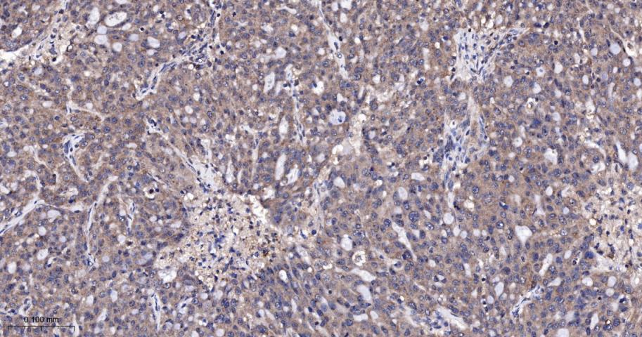Paraformaldehyde-fixed, paraffin embedded Human Liver; Antigen retrieval by boiling in sodium citrate buffer (pH6.0) for 15 min; The section was incubated with TSG101 Monoclonal Antibody, Unconjugated (bsm-52746R) at 1:200 overnight at 4°C, followed by conjugation to the bs-0295G-HRP and DAB (C-0010) staining.