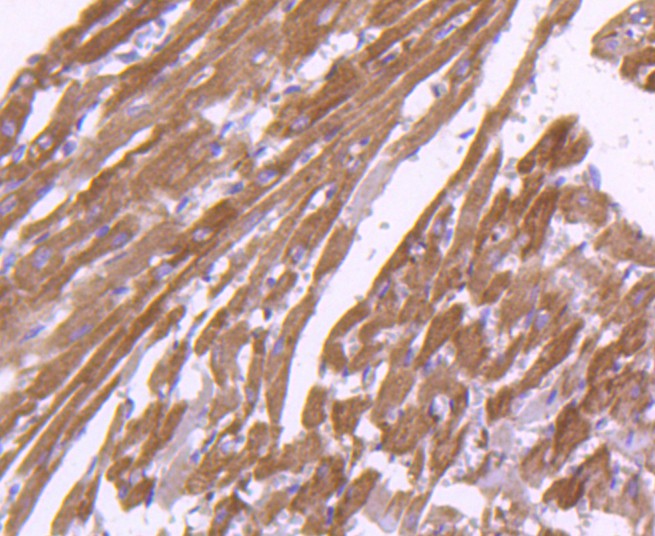 Paraformaldehyde-fixed, paraffin embedded (rat heart tissue); Antigen retrieval by boiling in sodium citrate buffer (pH6.0) for 15min; Block endogenous peroxidase by 3% hydrogen peroxide for 20 minutes; Blocking buffer (normal goat serum) at 37°C for 30min; Antibody incubation with (Calnexin) Monoclonal Antibody, Unconjugated (bsm-52639R) at 1:50 overnight at 4°C, followed by operating according to SP Kit(Rabbit) (sp-0023) instructionsand DAB staining.
